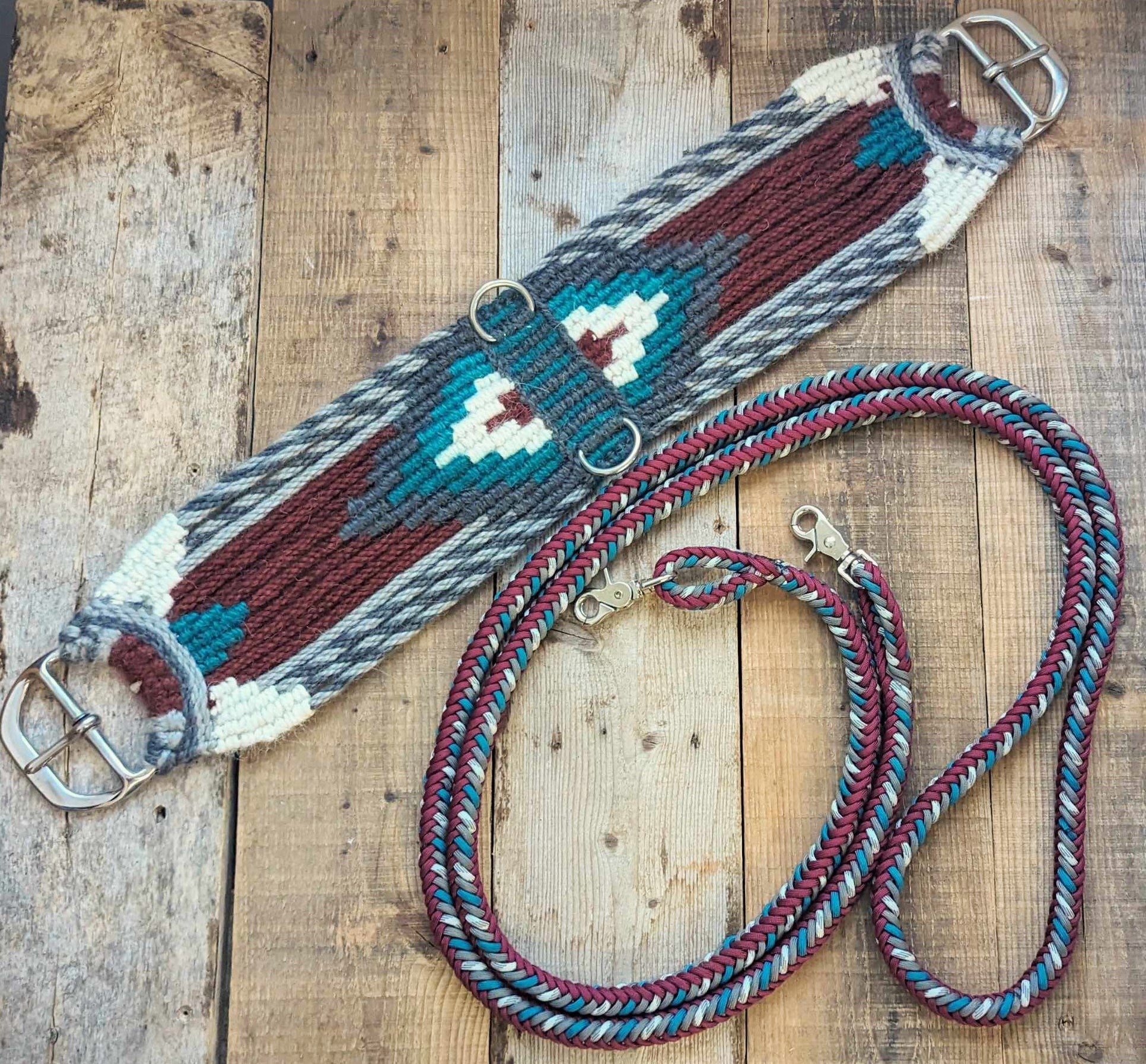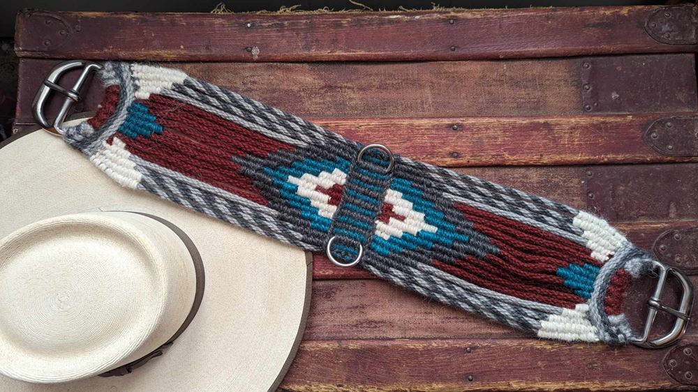 Very nice mohair cinch. Ddark gray, light gray, burgundy and teal.